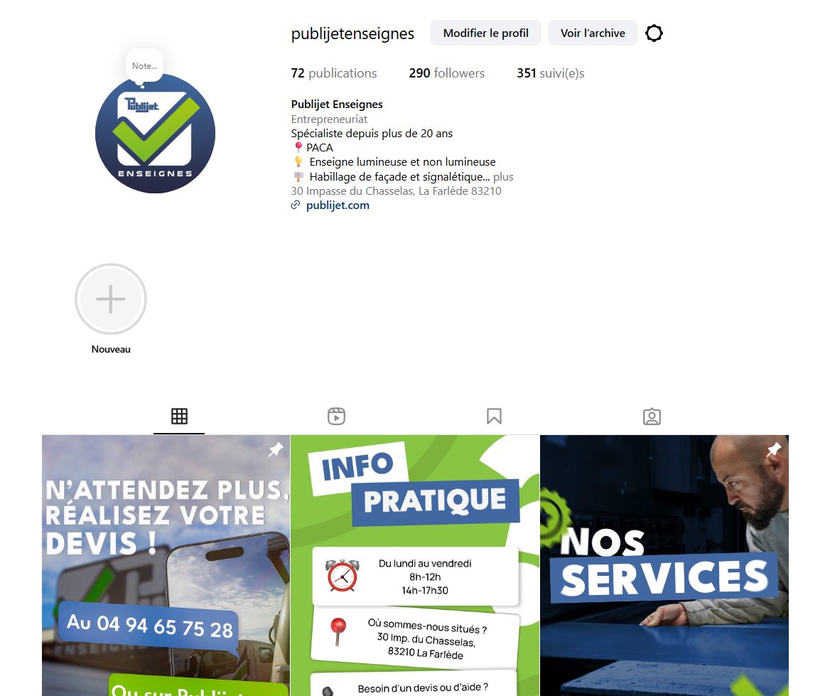 Pour ma deuxième année d’alternance, j’ai décidé de changer d’entreprise et de rejoindre Publijet, une société spécialisée dans la signalétique, l’impression et le flocage pour professionnels. L’entreprise souhaitait moderniser son image et renforcer sa présence en ligne, notamment sur LinkedIn et Instagram. C’est dans ce contexte que l’une de mes missions principales a été la refonte complète des réseaux sociaux. Travaillant en autonomie mais supervisé régulièrement par mon maître d’alternance, j’ai d’abord analysé leurs comptes existants ainsi que ceux de leurs concurrents afin d’identifier les manques et les opportunités.